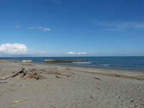 Das Boot legt im dichten Schilf an einem eher wackeligen Anleger an. Galant reicht Niky mir die Hand für den Ausstieg. Nach wenigen Schritten tritt die kleine Gruppe aus dem Schilfgürtel heraus und steht an einem weißen Sandstrand. Treibholz und einige recht windschiefe Unterstände für Fischer ergänzen das Bild. Die Adria! Majestätisch breitet sie sich vor mir aus.